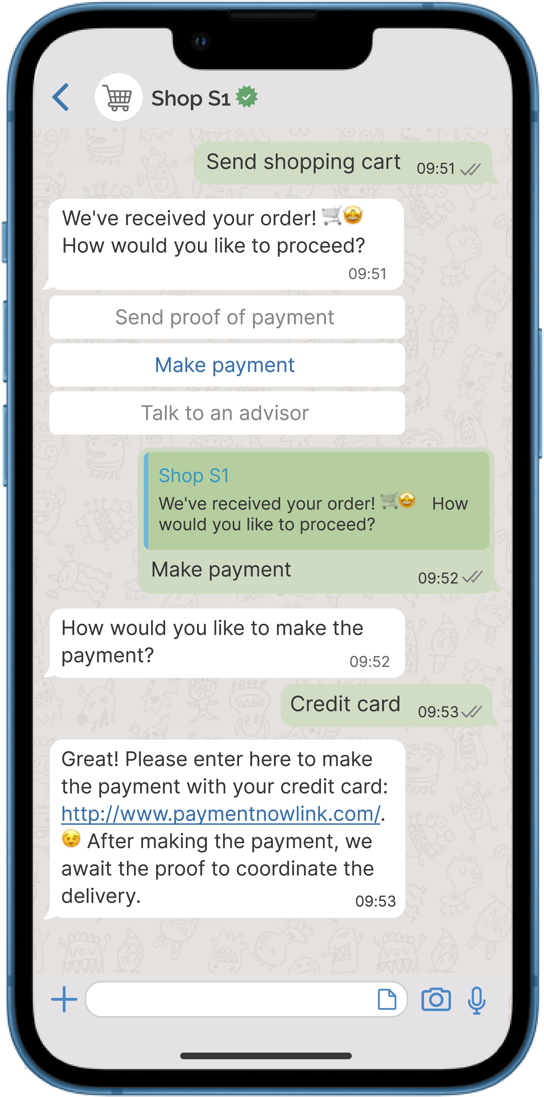 S1 is a PCI-DSS certified solution that allows you to offer shopping flows without taking the user out of the conversation.